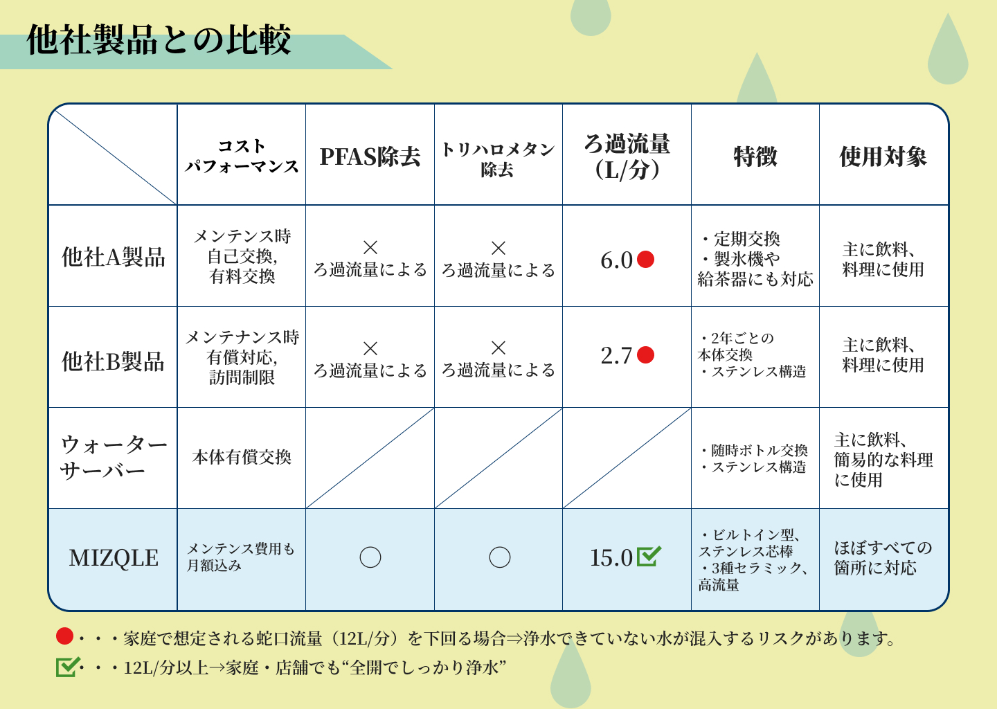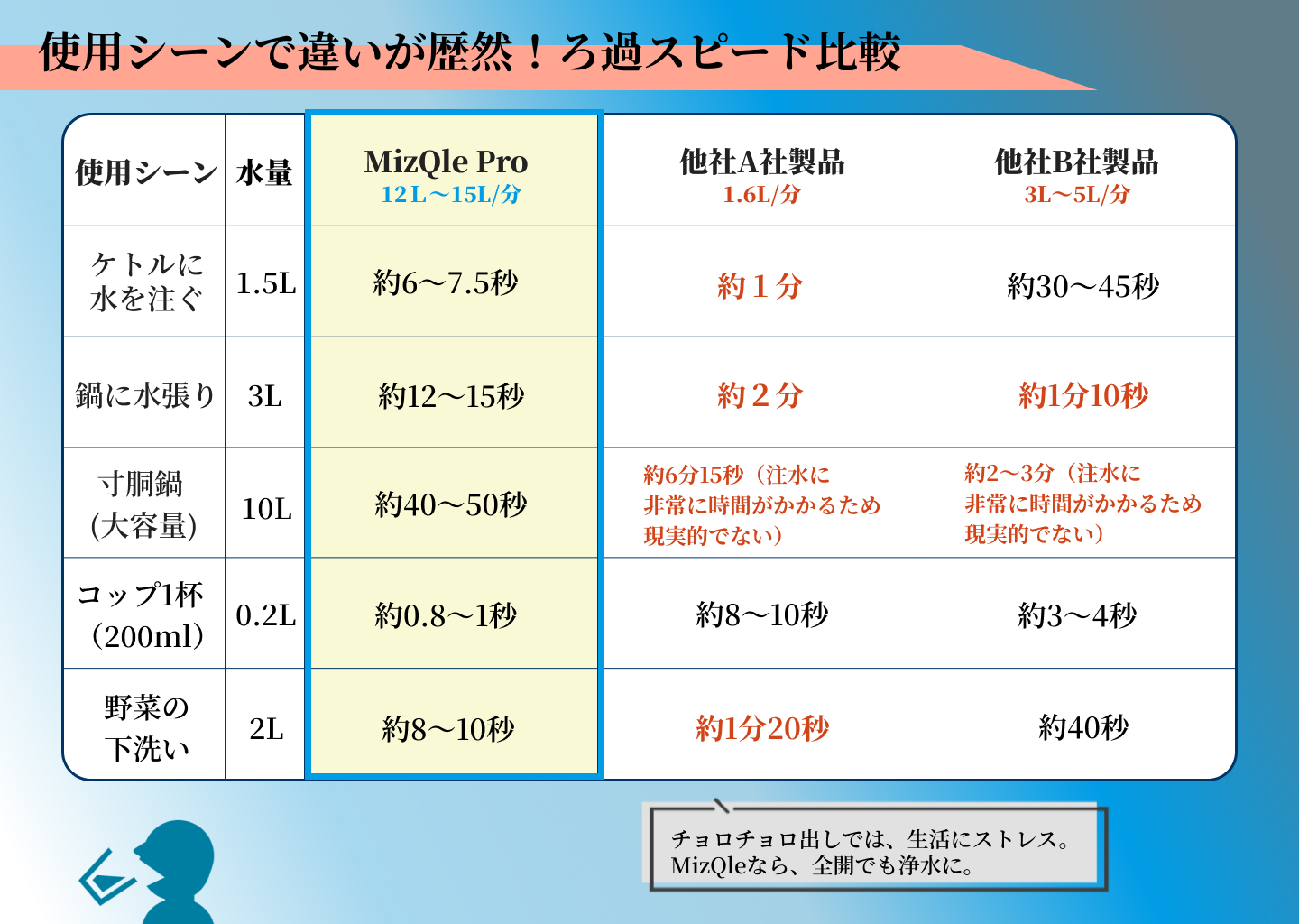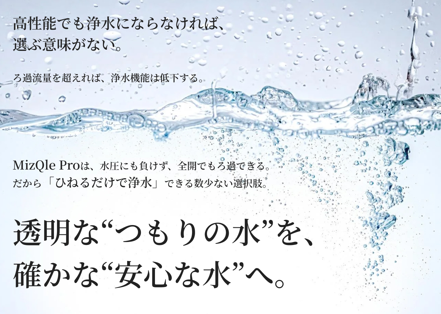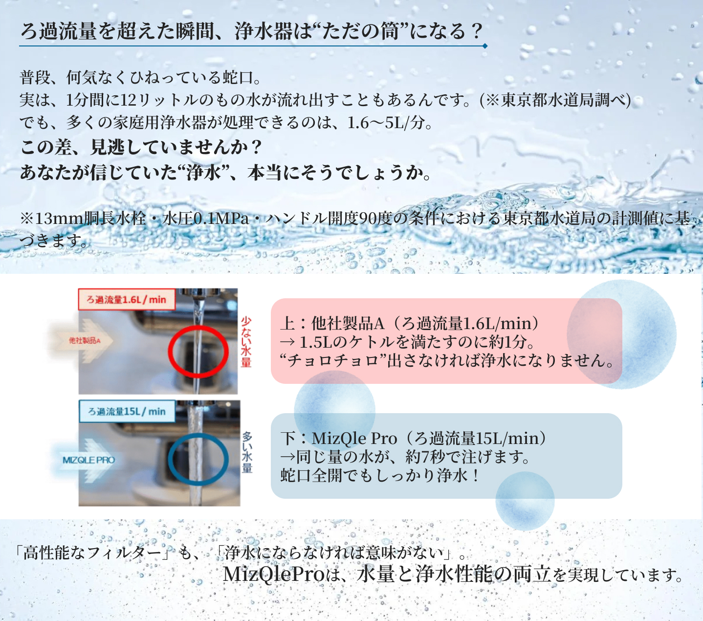 東京都水道局のデータによると、家庭の蛇口を全開にした際の水量は12L/分以上にもなる事があります。しかし、一般的な家庭用浄水器の対応流量は1.6〜5L/分程度で、それを超えると浄水機能が追いつかず、「ただの筒」となってしまうリスクがあります。MIZQLE PROは15L/分に対応し、蛇口を全開にしても安定して浄水できる設計です。