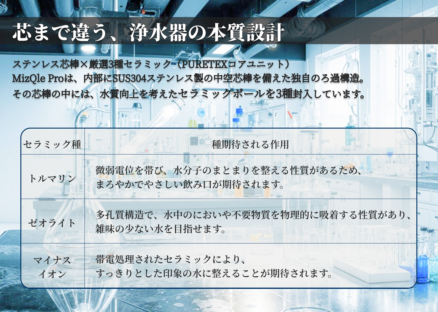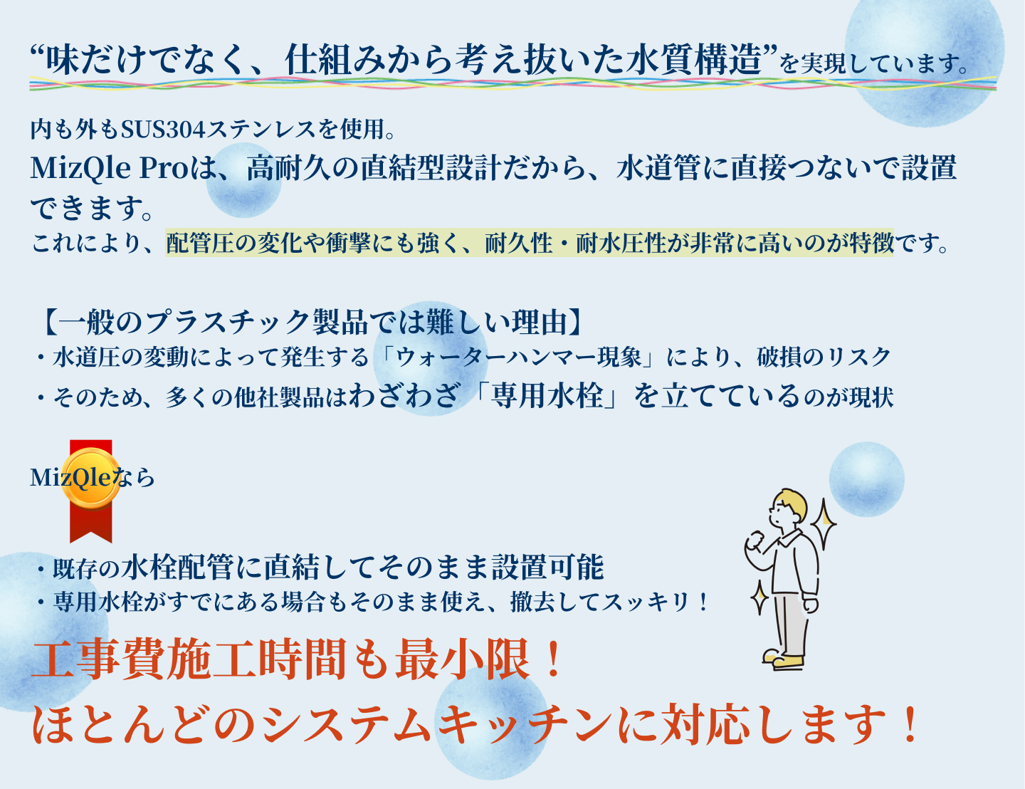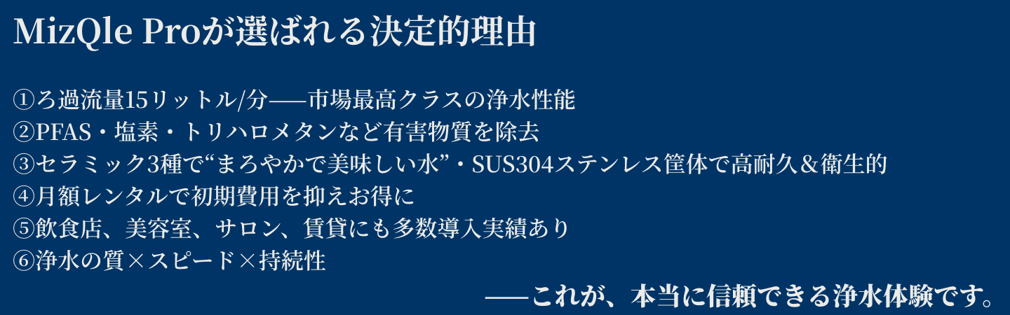 最大15L/分の高流量で、ご家庭の水をそのまま浄水場レベルの安心品質へと引き上げるMIZQLEシリーズ。ろ過性能・水量・耐久性のバランスに優れ、飲料水はもちろん、調理、シャワー、洗面、赤ちゃんのミルクづくりまで、暮らしのあらゆるシーンで水の質に妥協したくない方に最適です。